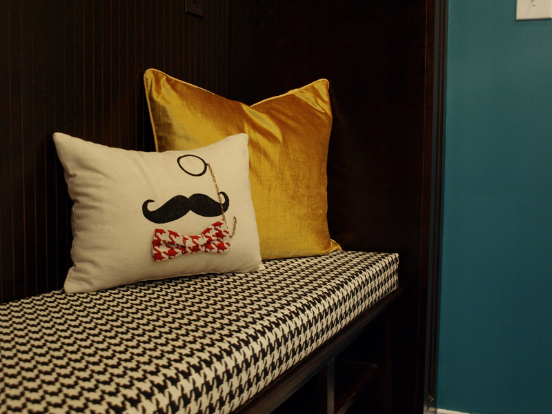 A black and white houndstooth (found at Hobby Lobby) seemed like the perfect fabric for the bench cushion, and the gold velvet pillows from Pier 1 help give it the distinguished English butler air.