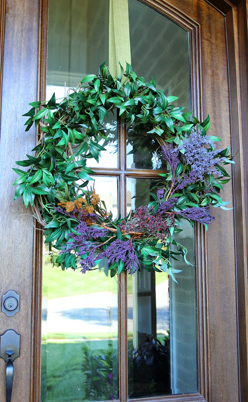 My keep-it-simple plan for fall has now extended to the front porch where I transformed my go-to green wreaths from Summer to Autumn in about 5 minutes.