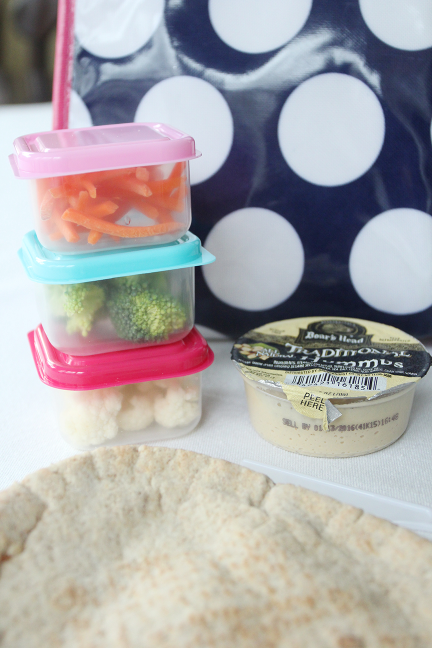 A good vegetable pizza option is to start with hummus, then add broccoli, carrots, cauliflower, and cheese. Lots of nutrition here!