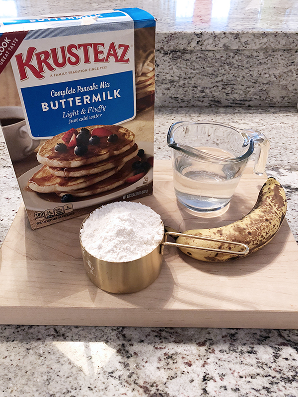 To make these, just start with your favorite complete pancake mix. You’ll also need water for the mix, an over-ripe banana or two, and some granola!